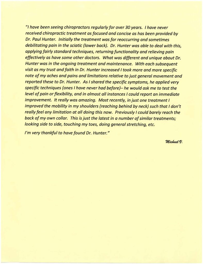 At age 20, Dr. Hunter had an accident that resulted in a fractured spinal vertebra. The Orthopaedic Surgeon informed Dr. Hunter that he required spinal fusion of neck vertebrae C4-C5-C6. Dr. Gus Lodewyks, a chiropractor in Winnipeg, analyzed the x-rays of a fracture and informed Dr. Hunter that surgery was not indicated.  Dr. Lodewyks was a Gonstead technique trained practitioner. This training allowed him to work on Dr. Hunter’s spine with a fracture present. Through chiropractic care, Dr. Hunter recovered completely and was inspired to become a chiropractor himself!